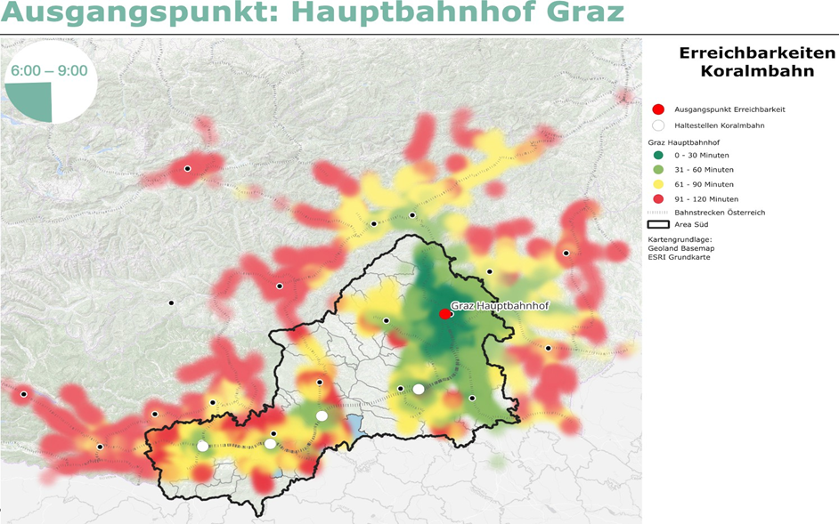 Das Beispiel einer Analyse im Verkehrsmodell Österreich zeigt die Erreichbarkeit verschiedener Standorte in der AreaSüd und darüber hinaus mit Öffentlichen Verkehrsmitteln (Fahrplan 2026) in der Zeitscheibe 6:00 bis 9:00 Uhr im Werktagsverkehr vom Ausgangspunkt Hauptbahnhof Graz aus.